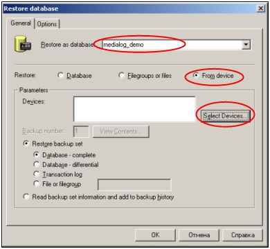 3.В поле Restore as database ввести имя базы (например, medialog_demo) и установить переключатель Restore в положение From device.