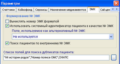 По умолчанию проверка дубликатов пациентов производится при создании ЭМК по полям Фамилия, Имя, Отчество таблицы Пациенты. Существует возможность включить в проверку дополнительные поля, которые предполагаются уникальными для каждого пациента. Проверка по этим полям производится как при создании ЭМК, так и при редактировании данных контролируемых полей на экранных формах.