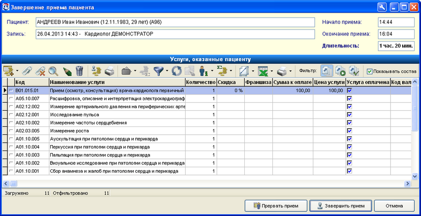 ·Завершить прием – следует нажать для окончательного завершения приема;