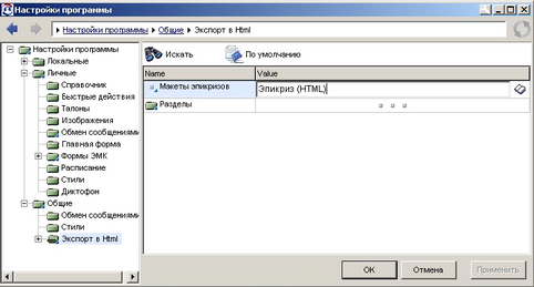 7.Выбрать пункт меню Пациент \ Экспорт ЭМК, кнопка Настройки экспорта; либо пункт меню Врач \ Личные настройки. Выбрать пункт Настройки программы \ Общие \ Экспорт в Html (рис. 1.4). |
