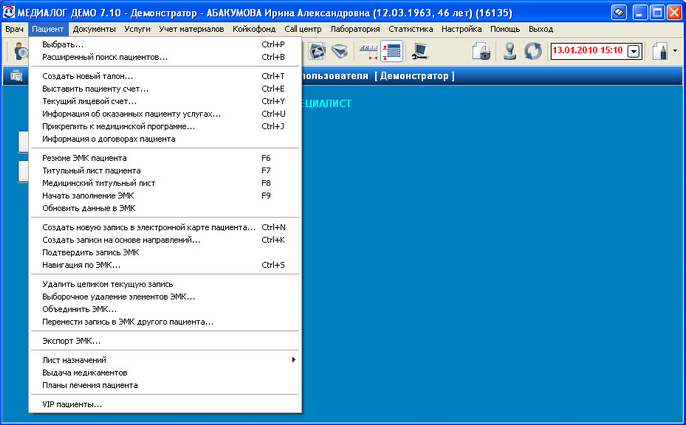 Основные возможности модуля "ЭМК" медицинской информационной системы МЕДИАЛОГ доступны в пункте Пациент основного меню программы (рис. 1).