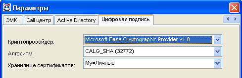 На вкладке Цифровая подпись (рис. 3) определяются общие для всех пользователей настройки цифровой подписи: Криптопровайдер, Алгоритм, Хранилище сертификатов. Все значения выбираются из фиксированных списков: добавить в них свои значения нельзя.