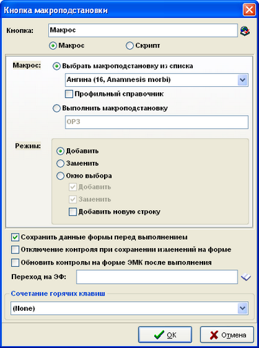 Флажок Обновить контролы на форме ЭМК после выполнения устанавливается при необходимости автоматически обновить данные на экранной форме после того, как выполнена макроподстановка: при этом выполняется пересчет формул видимости и доступности объектов, а также обновляются локальные запросы.