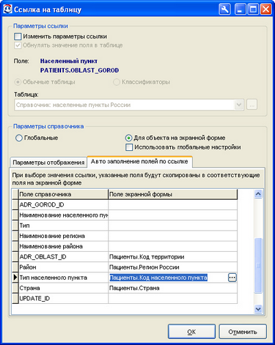 Если снять флажок Использовать глобальные настройки (рис. 2.5.13), появится вкладка Автозаполнение полей по ссылке. На данной закладке можно установить соответствия между полем справочника и полем экранной формы, и при выборе значения по ссылке поля экранной формы будут заполняться соответствующими значениями. Пример использования: на экранной форме расположены адресные поля: Область, Населенный пункт, Тип населенного пункта. При выборе населенного пункта автоматически заполнится область и тип населенного пункта.