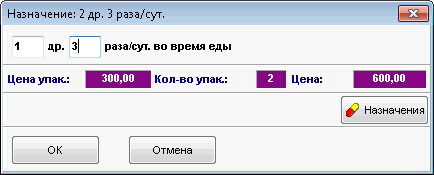 2.в окне можно провести назначение согласно предложенной схеме, например, 2 таблетки 3 раза в сутки и нажать OK; В окне также показаны необходимое количество упаковок и их стоимость.