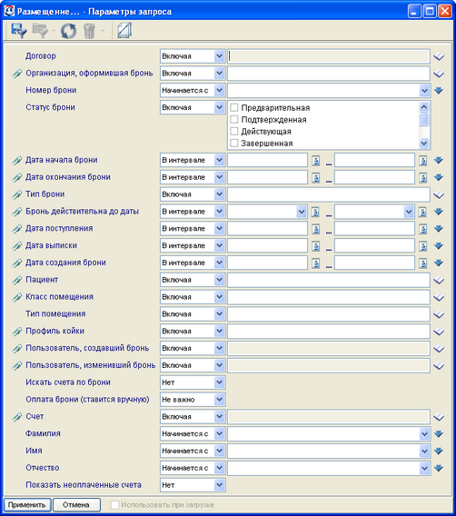 Доступ к бронированию осуществляется через пункт меню Койкофонд / Размещение. При этом открывается фильтр, в котором задаются параметры отбора ранее созданных броней (рис. 5.1). После задания параметров фильтра нужно нажать кнопку Применить, откроется список броней (рис. 5.2).