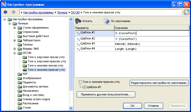 В окне проигрывателя DICOM можно добавить дополнительную информацию, прописав соответствующие тэги в личных настройках пользователя (меню Пользователь / Личные настройки, раздел Настройки программы / Личные). В группе настроек DICOM выбирается положение для дополнительной информации (например, Тэги в нижнем правом углу) и задаются шаблоны, каждый из которых соответствует строке текста. В шаблонах доступны следующие тэги:
