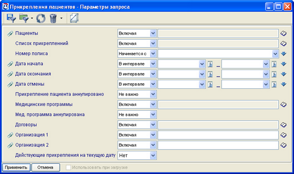 При запуске прикреплений открывается окно (рис. 10.1), в котором задаются условия для отбора прикреплений. Если установлен параметр Действующие прикрепления на текущую дату в положение «Да», то отобразится список всех действующих прикреплений. Если этот параметр в положении «Нет», то отобразится весь список прикреплений, в том числе и неприкрепленные пациенты.