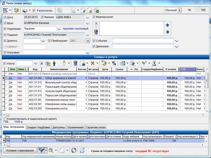 Если в настройках сложной услуги цена определяется по составу, то при формировании печатной формы талона и счета пациента в отчетах отображается лишь одна строка с названием сложной услуги.
