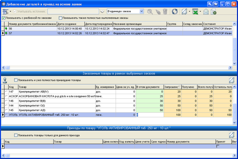 Рисунок 5.5.4. Добавление товаров в приход на основе заказов поставщику