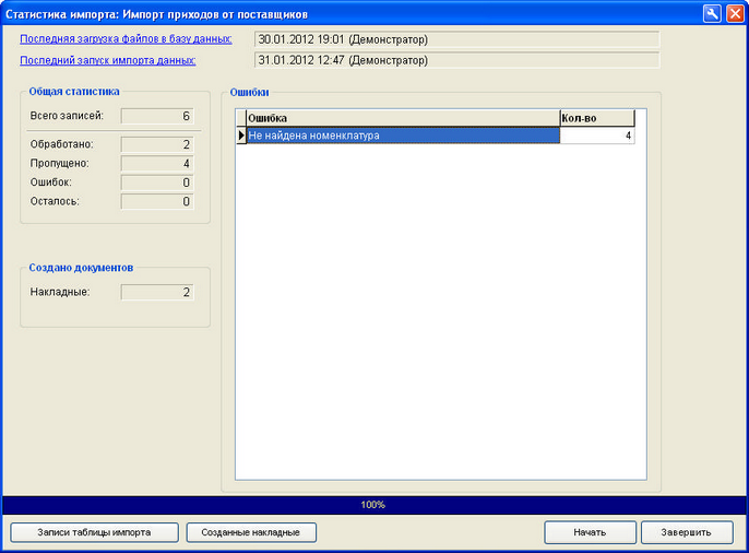 В нижней части окна Статистика импорта расположена бегущая строка, показывающая процент обработанных (в том числе, проимпортированных) данных. Кнопки Начать и Завершить позволяют в любой момент прервать, а затем продолжить процесс импорта.