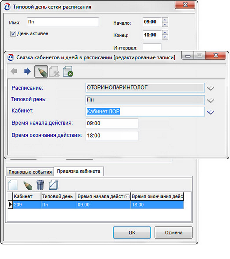 ·Также в нижней части имеется закладка Привязка кабинета (рис. 5.15). В данном списке имеется возможность задания связки кабинетов и дней в расписании с указанием времени начала и окончания действия типового дня для выбранного кабинета.