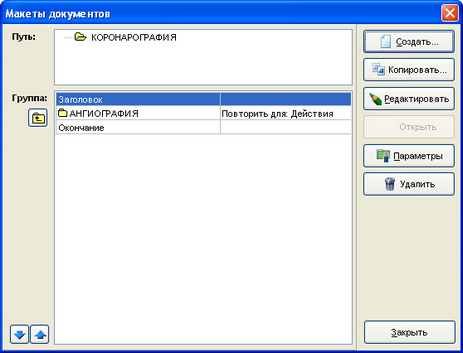 Созданный групповой макет отмечается в списке макетов знаком "папка". Если Открыть такой макет, откроется окно (рис. 7), в котором создаются составные части данного макета. Здесь, аналогично описанному выше, можно создавать простые и групповые макеты. Эти макеты будут отображаться в итоговом документе в том порядке, в каком они расположены в группе. Чтобы изменить порядок макетов, используются кнопки вертикального перемещения, расположенные в левой нижней части окна. Порядок макетов также можно менять, перетаскивая их мышью на нужное место.